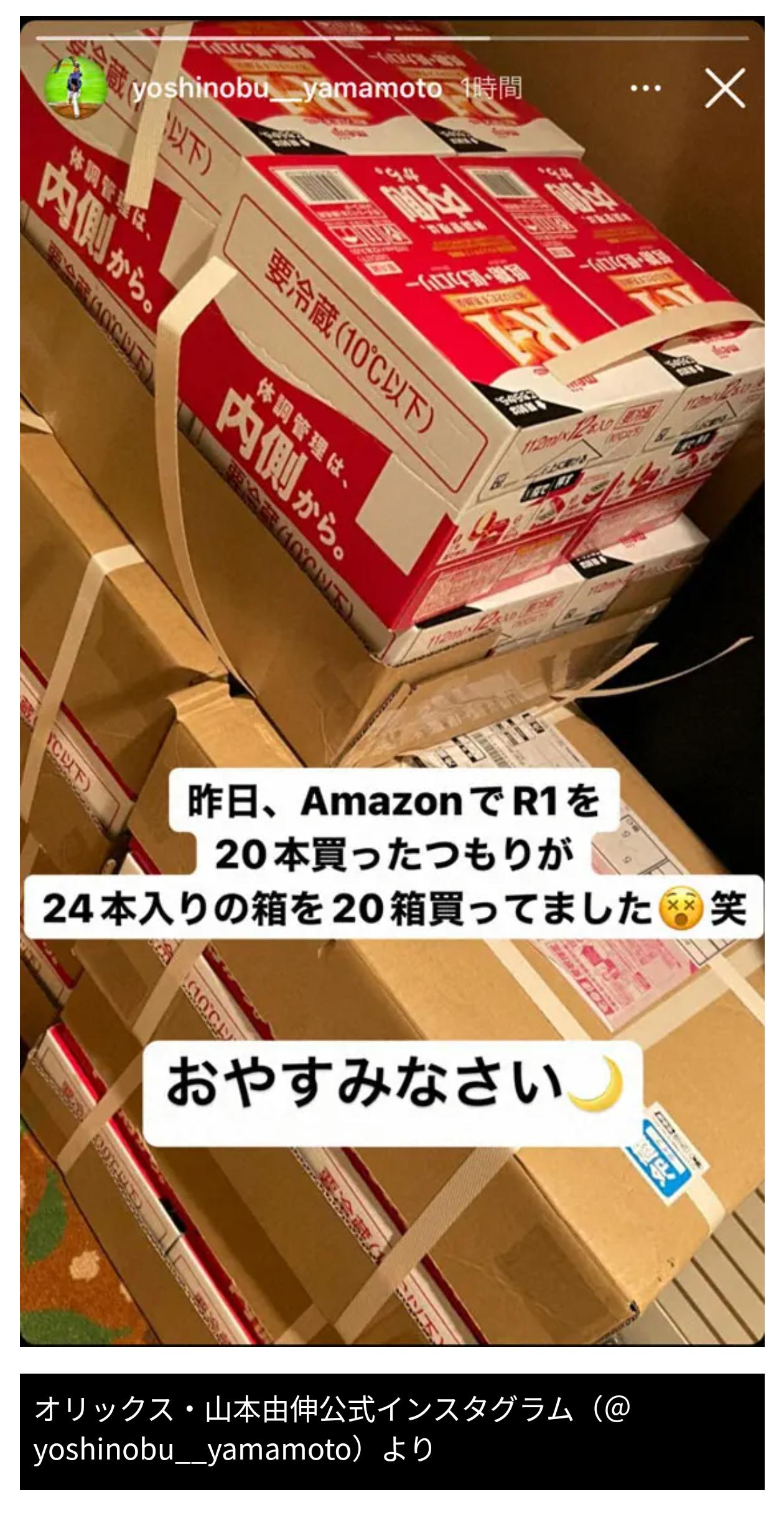 【画像】山本由伸さん「R1を20本注文したつもりが、24本入り箱を20箱買ってました!」